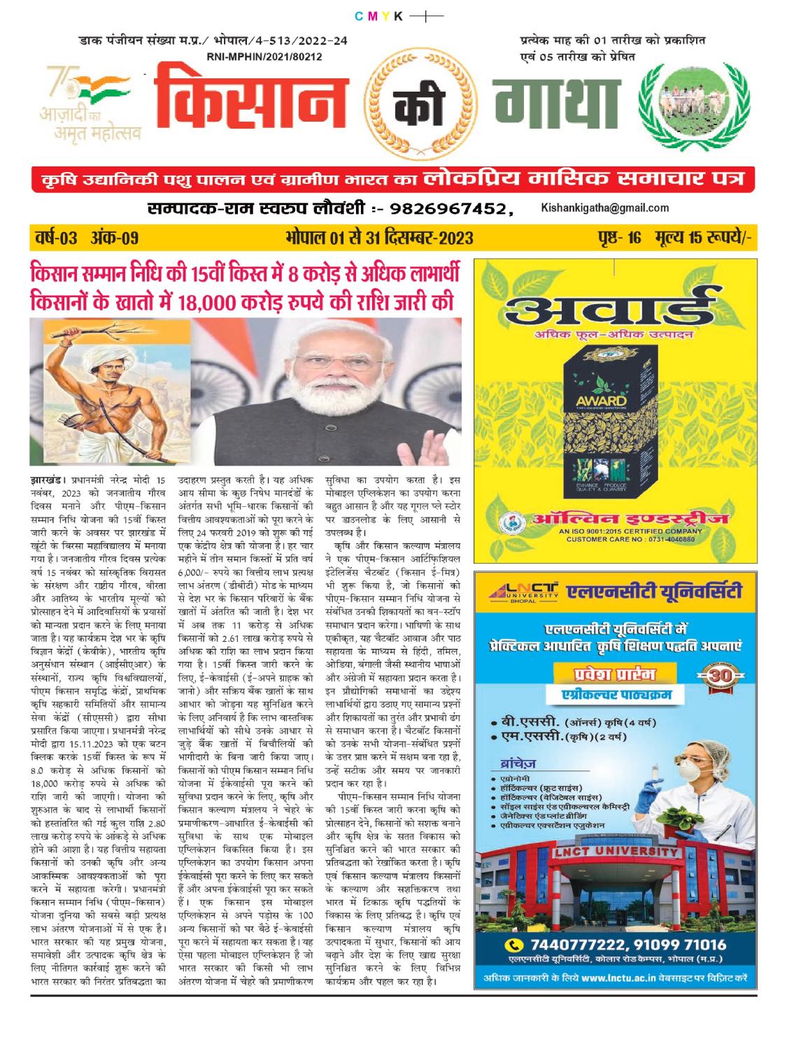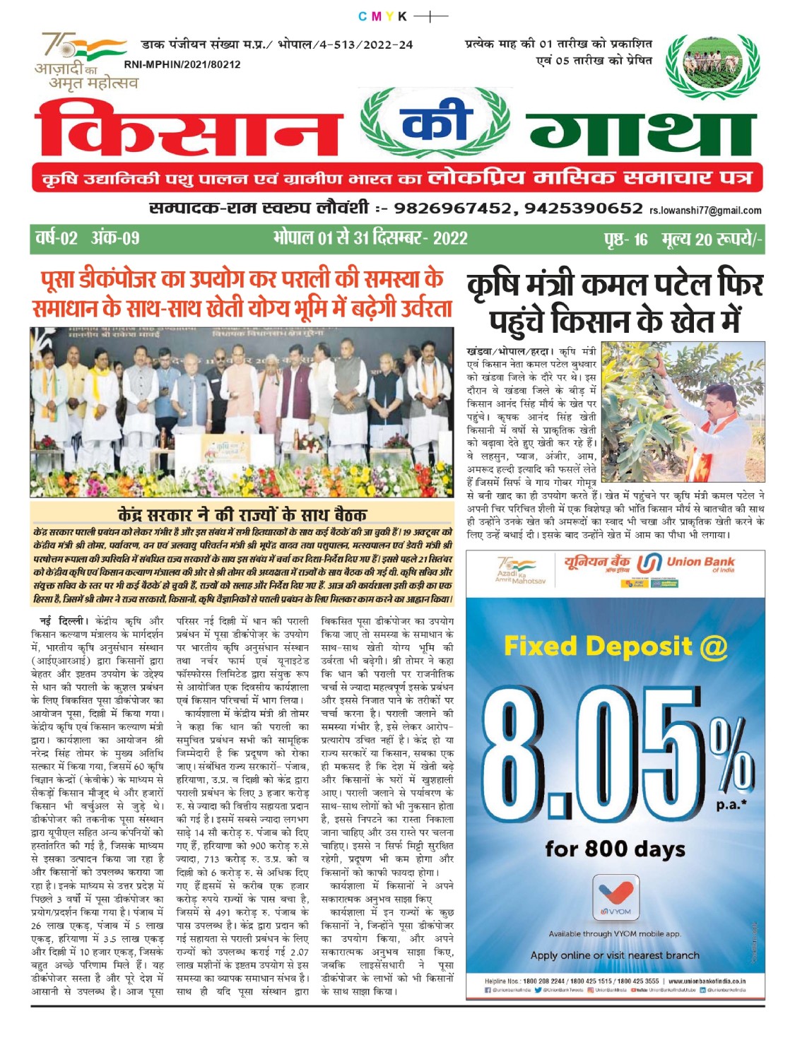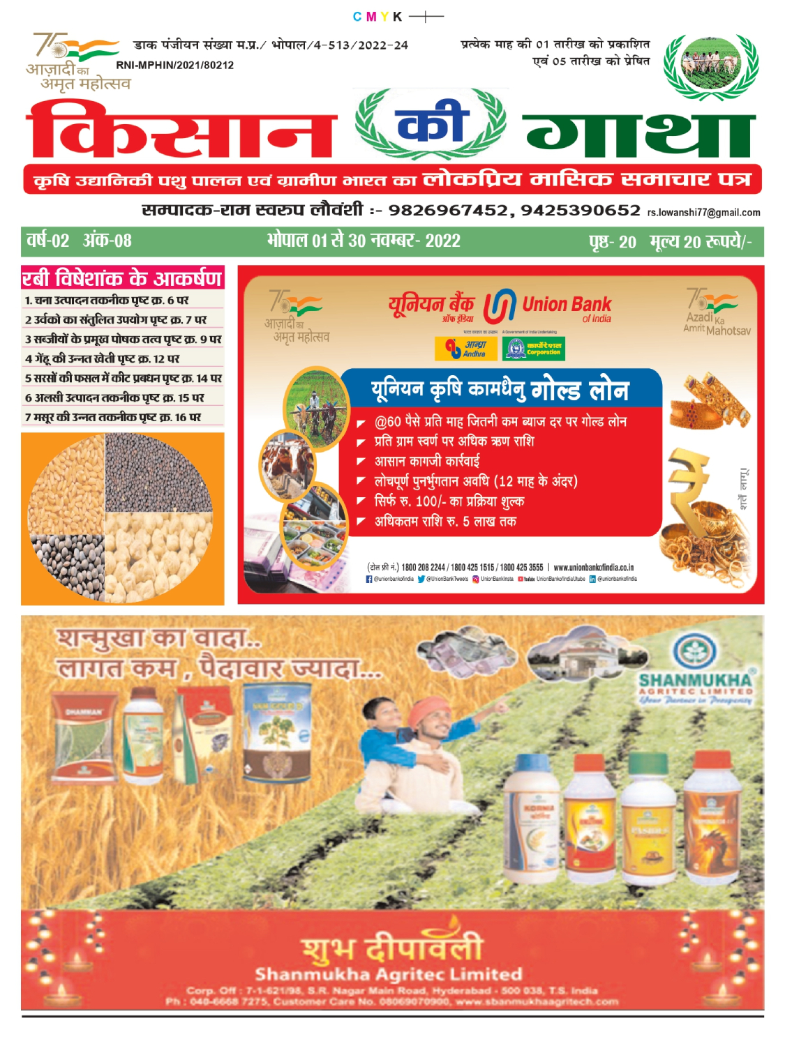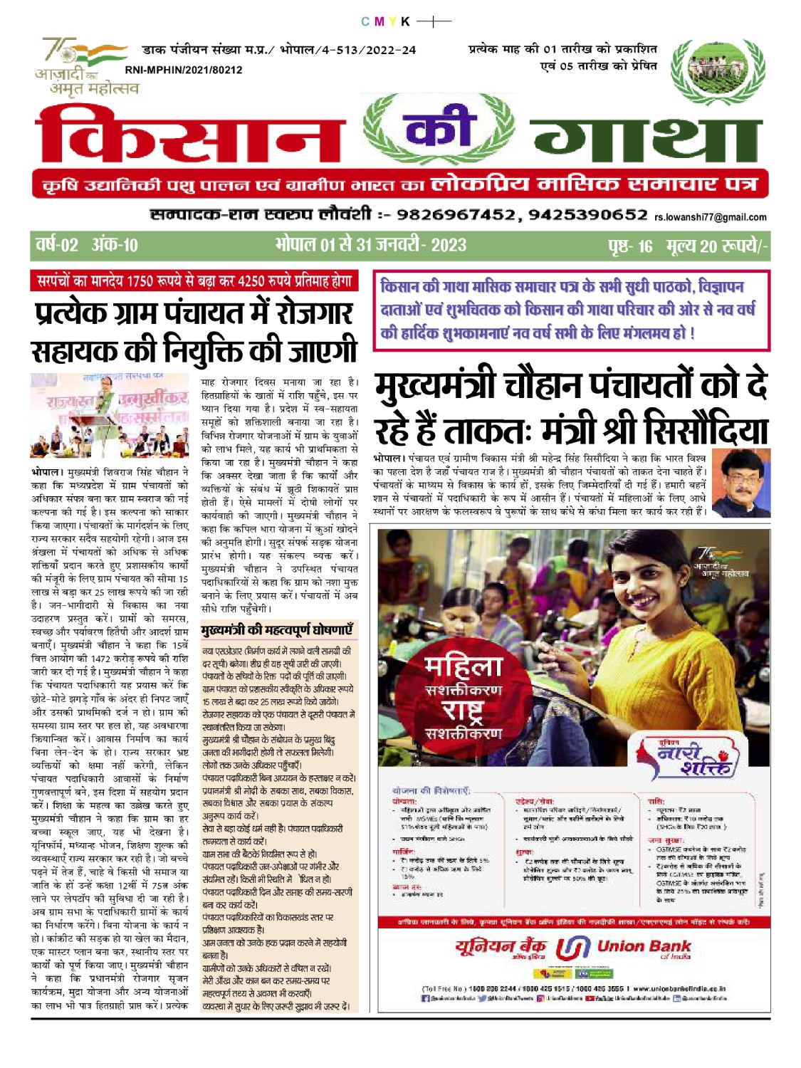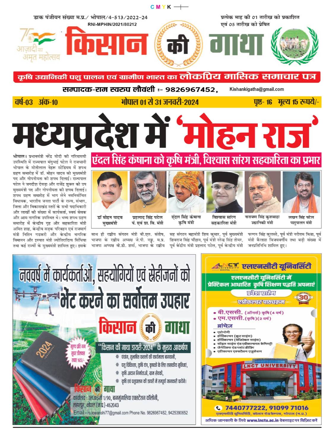 Kisan Ki Gatha is a popular monthly newspaper of Agriculture, Horticulture, Animal Husbandry, and Rural India. It is published on the 1st of every month and observed on the 15th.