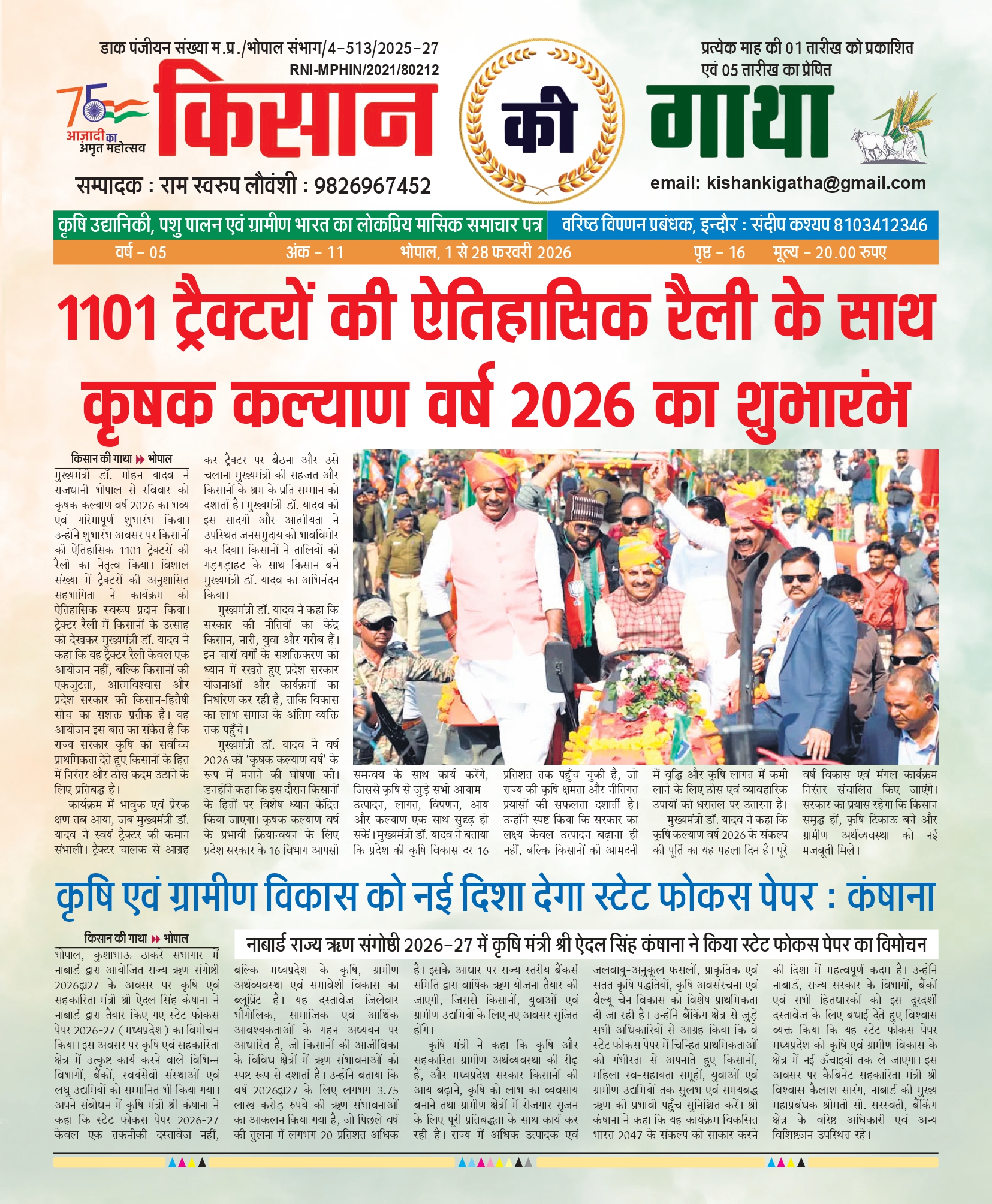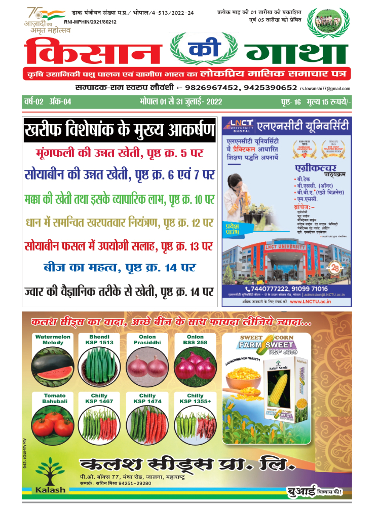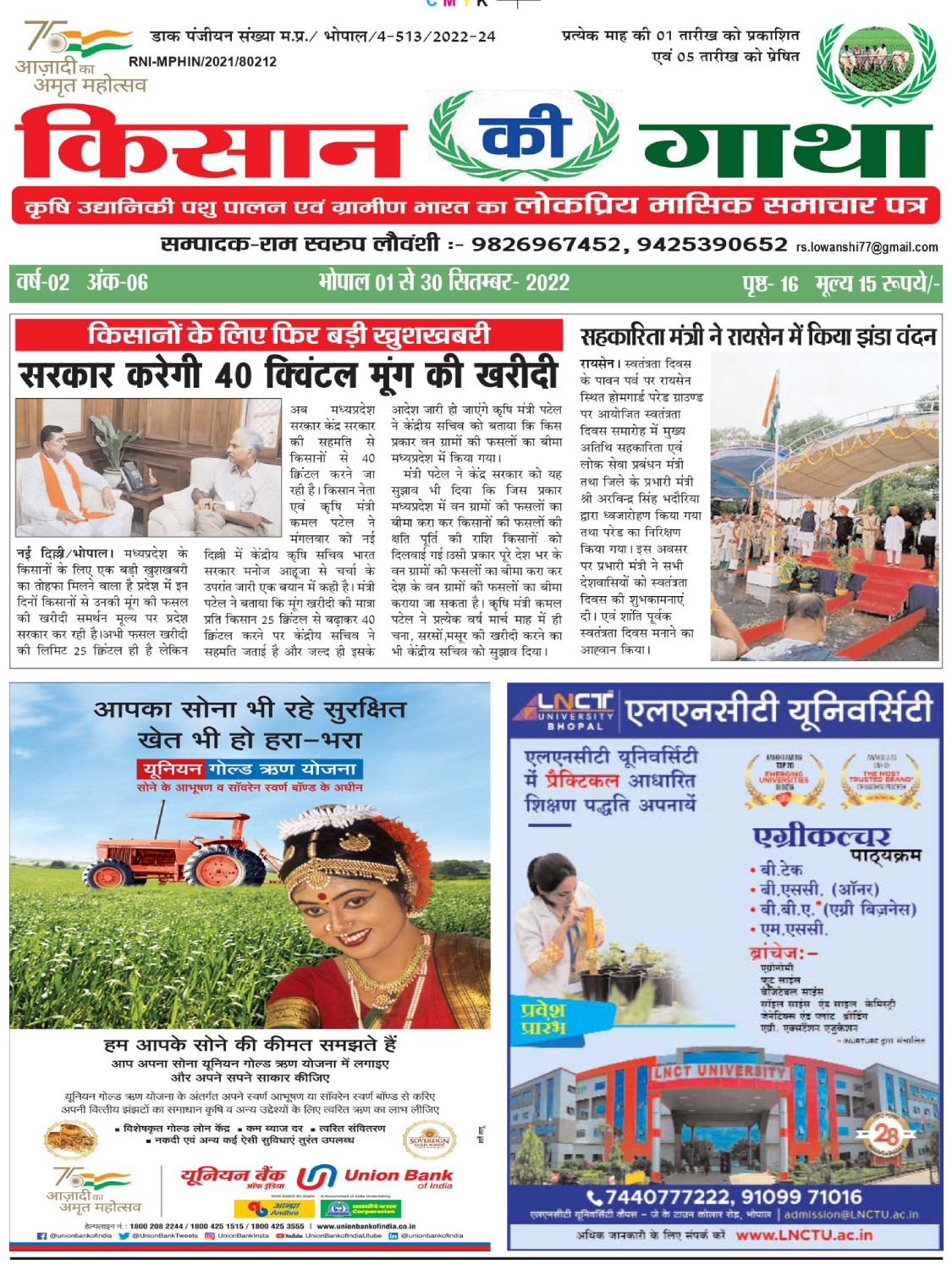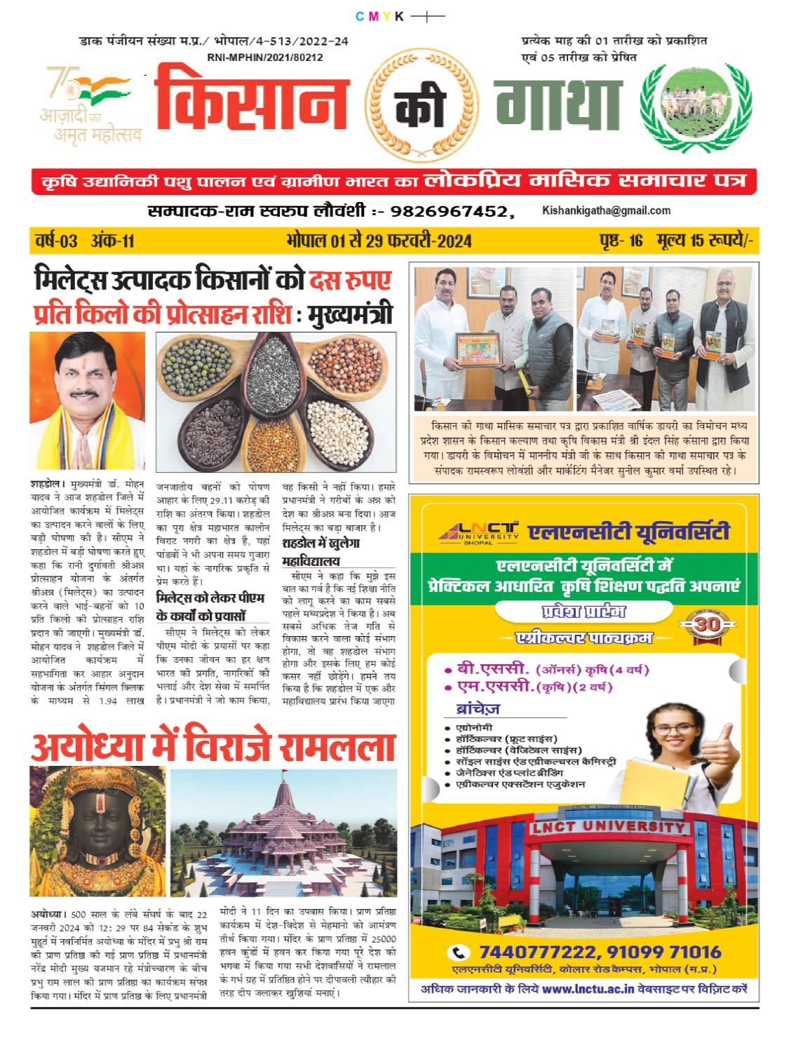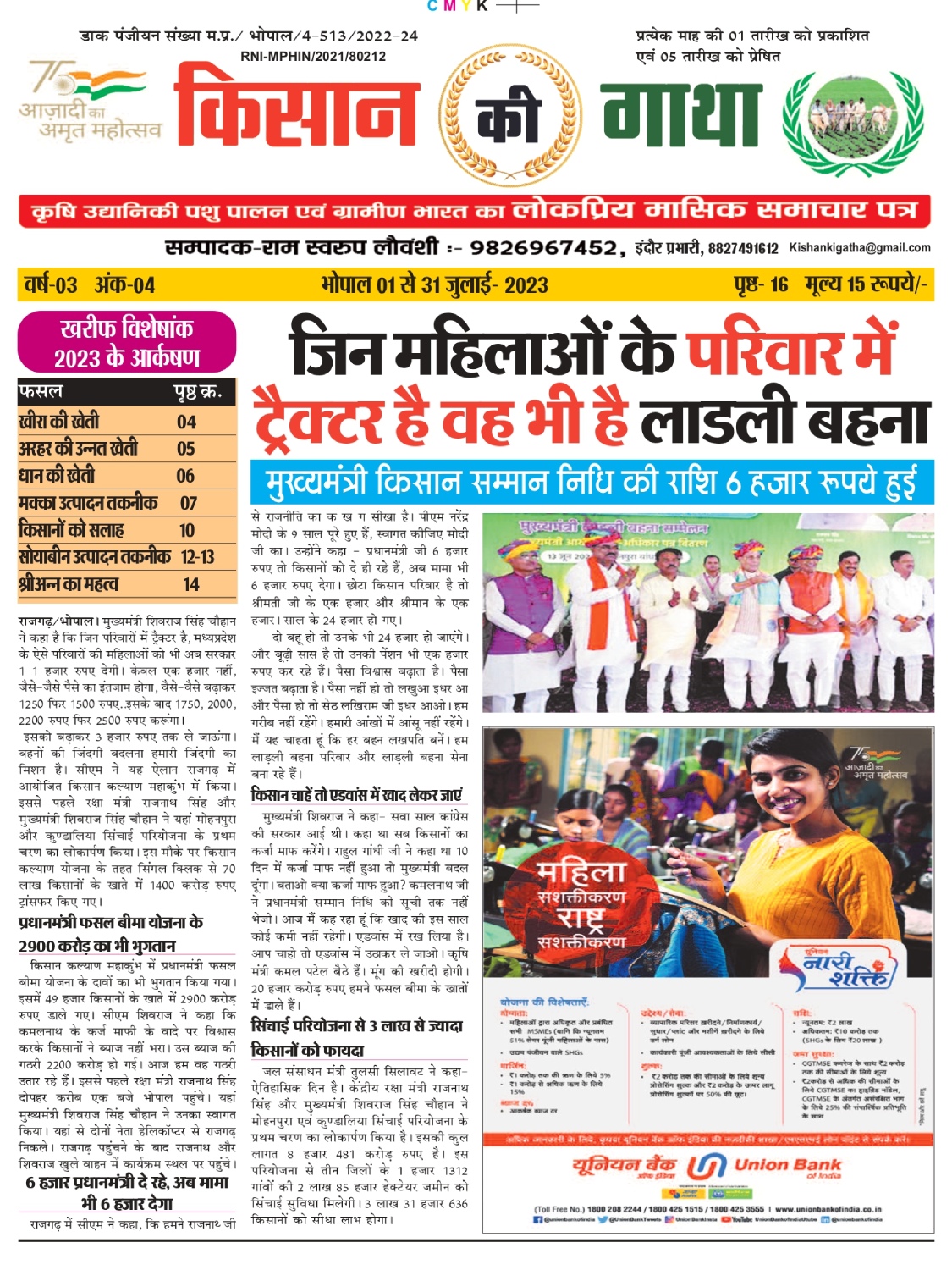 Kisan Ki Gatha is a popular monthly newspaper of Agriculture, Horticulture, Animal Husbandry, and Rural India. It is published on the 1st of every month and observed on the 15th.
